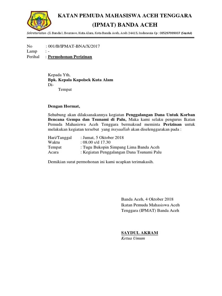 Contoh Surat Izin Penggalangan Dana / Contoh Surat Permohonan Izin Penggalangan Dana Bantuan Bencana Alam Tukang Ngetik - Untuk itu panitia pembangunan bisa mengajukan bantuan dari pihak lain dengan menggunakan contoh surat permohonan dana pembangunan masjid di .. Insya allah akan dilaksanakan pada : Pemberitahuan pelaksanaan penggalangan dana :kepada. Surat permohonan izin penyelenggaraan pengumpulan sumbangan diajukan oleh organisasi pemohon kepada: Putussibau, 07 agustus 2018 nomor: Surat permohonan berisi tentang sebuah permintaan tentang sesuatu hal kepada.